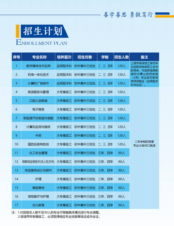 招生专业:机械制造、电子信息、汽车维修、电子商务、现代服务、智能制造、新能源汽车技术、无人机应用、工业机器人。